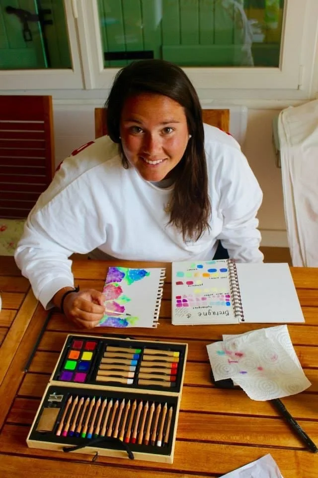 Sarah V. Roberts is a custom watercolor and multimedia artist with a lifelong passion for storytelling. Before dedicating herself more fully to art and design, Sarah taught prep school literature and coached field hockey and tennis—experiences that deepened her appreciation for narrative, connection, and creativity. She holds a Master’s in English from the Bread Loaf School of English at Middlebury College and has always found joy in weaving stories of all types– both written and visual.